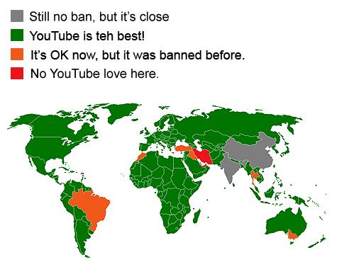 במפה הבאה אפשר לראות איפה השימוש ביו-טיוב אסור ואיפה הוא אסור חלקית או היה אסור בעבר. תשמחו לדעת שלמרוקאים מותר להשתמש שוב ביו-טיוב.
