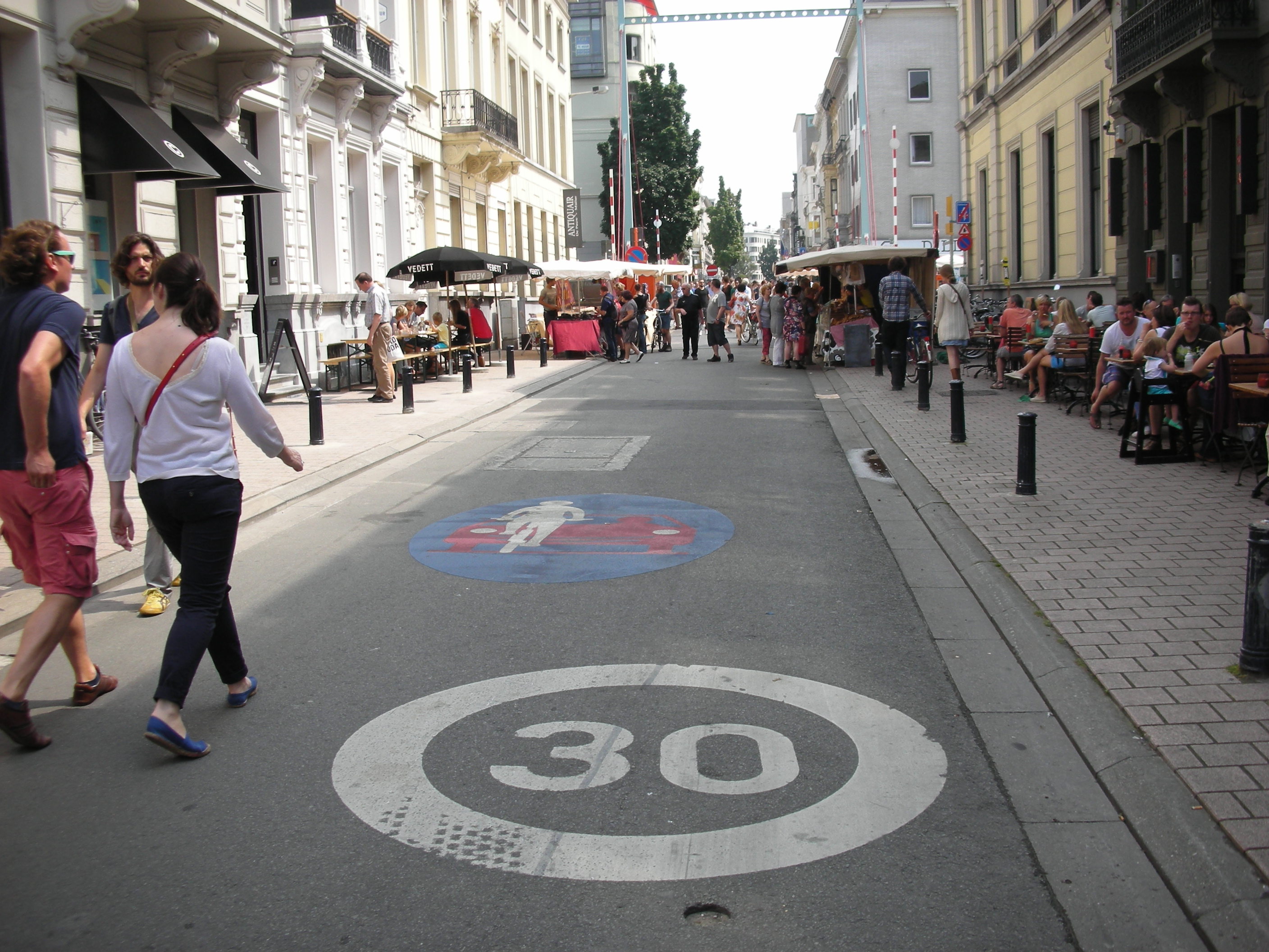 בתל אביב מנסים להכניס את העניין של מיתון תנועה, בשלב הזה בעיקר בתמרורים, שלא ברורה מידת ההצלחה שלהם. בכל מקרה, ברחובות קטנים רבים, בגלל הגיאומטריה שלהם, בכל מקרה לא ניתן לנסוע מעל 30 קמ"ש. רחובות מסוג זה נוטים להיות בטוחים לרכיבת אופניים על הכביש וזה הנוהל שבו פועלים גם בהולנד, דנמרק ומדינות לא-מפגרות אחרות. כדי להבהיר לנהגי מכוניות שחתיכת האספלט שהם משתמשים בה ברחובות אלה אינה מיועדת למכוניות בלבד, משתמשים בתמרור מיוחד שמדגים שלאופניים יש זכות קדימה (לעתים מלווה גם בתמרור שמתיר לאופניים המפורש לנסוע על הכביש נגד כיוון המכוניות ברחובות חד סטריים צרים). בגנט שבבלגיה (שהיא מדינה הרבה פחות מתקדמת מהולנד בכל מה שנוגע לתכנון תחבורתי) נתקלתי במספר ורסיות של התמרור הזה. הנה אחת שצויירה על הכביש כולל הקמ"ש המותר וסדר החשיבות של משתמשי הדרך:
