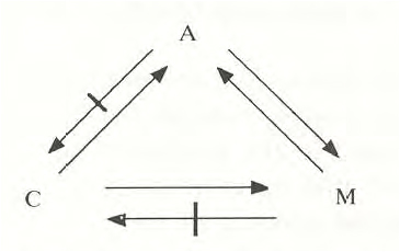 המחקר שלנו מתבסס על תיאוריית תחביר המרחב (space syntax), שמדגישה את הדומיננטיות של מבנה רשת הרחובות על תהליכים אורבניים מגוונים. אחד המאמרים המוכרים יותר בתחום הזה עוסק בקשר בין המבנה העירוני ותנועת הולכי הרגל. מדובר במאמר של ביל הילייר וחברים משנת 1993 שמתאר את התנועה הטבעית של אנשים במרחב העירוני ומחבר בין תנועה, שימושי קרקע ומבנה הרשת הרחובות. הילייר מציע את הדיאגרמה הבאה לתיאור האינטראקציה בין תנועה למימדים המרחבי והפונקציונאלי. הוא מראה שלמבנה המרחבי יש השפעה על תנועה ושימושי קרקע, אבל שלשימושי קרקע ותנועה אין השפעה על המבנה המרחבי. לתנועה ולשימושי קרקע ישנה השפעה הדדית זה על זה, כלומר תנועה יכולה לעודד התפתחות של מסחר שבתורו יכול להגביר את התנועה. בדיאגרמה שלהלן M מתאר תנועה (Movement), מסחר מסומן ב-A בשביל Attraction ו-C מסמל את המבנה המרחבי (Confguration).