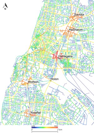 בהתמקדות באזור תל אביב מלבד סבידור והשלום, ניתן לראות שהתחנה עם פוטנציאל הפיתוח הרב ביותר בסביבתה היא תחנת ההגנה שהפער בין המרכזיות שלה לעוצמה הבנוייה בקרבתה גדול מאוד. זאת גם התחנה היחידה בתל אביב שבה ניתן שטח עבור חנייה בחינם (!) מה שמעיד על ניצול קרקע מאוד לא יעיל מבחינה כלכלית ותחבורתית. תחנה זו אף צפוייה להתחזק עם פתיחת הקו מירושלים שמגיע ישר אליה. בנוסף, תחנה נוספת עם פוטנציאל מסויים היא תחנת יוספטל שממוקמת בין בת-ים למרכז חולון ובנגישות טובה לשני הכיוונים. לשמחתנו, עיריית בת-ים עורכת תכנית לפיתוח אינטנסיבי בקרבת התחנה כולל בנייני משרדים ואני מניח שגם בצד של חולון תיערך תכנית דומה בהמשך. להלן המפה של מרכז המערכת הרכבתית (ניתן גם לראות את תחנת צומת חולון שניצבת לה בשממה).